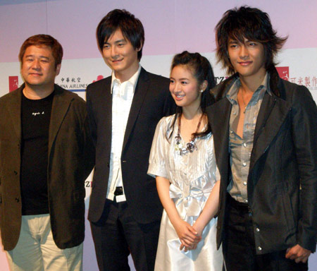 BSデジタル放送BS-iで4月26日に放送が終わった台湾ドラマ『イタズラなKiss~悪作劇之吻~』の続編の製作決定と、このドラマの関連イベントの東京での開催を記念して、瞿友寧(チュウ・ヨウニン)監督と主演した台湾人気俳優の鄭元暢(ジョセフ・チェン)、林依晨(アリエル・リン)、アイドルグループ・飛輪海(フェイルンハイ)のジローこと汪東城(ワン・トンチェン)(=写真左から)が来日し、6日、都内で記者会見を行った。会見はジョセフの流暢な日本語で幕を開けた。「今日は雨です。皆さん、大変でしたか?」と取材報道陣へのねぎらいも忘れない。